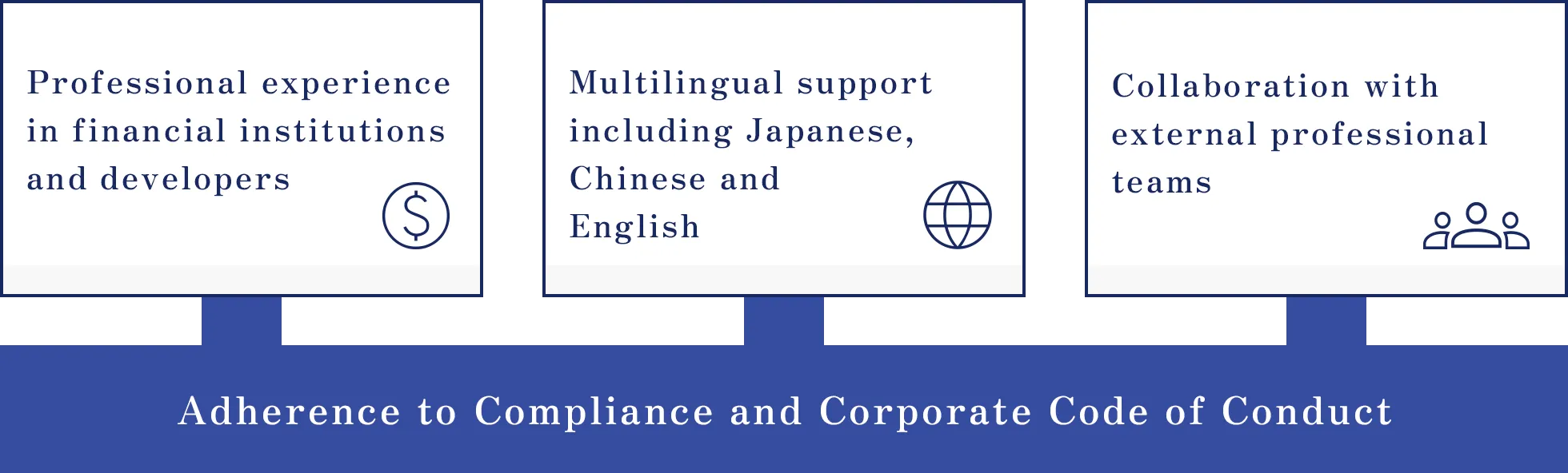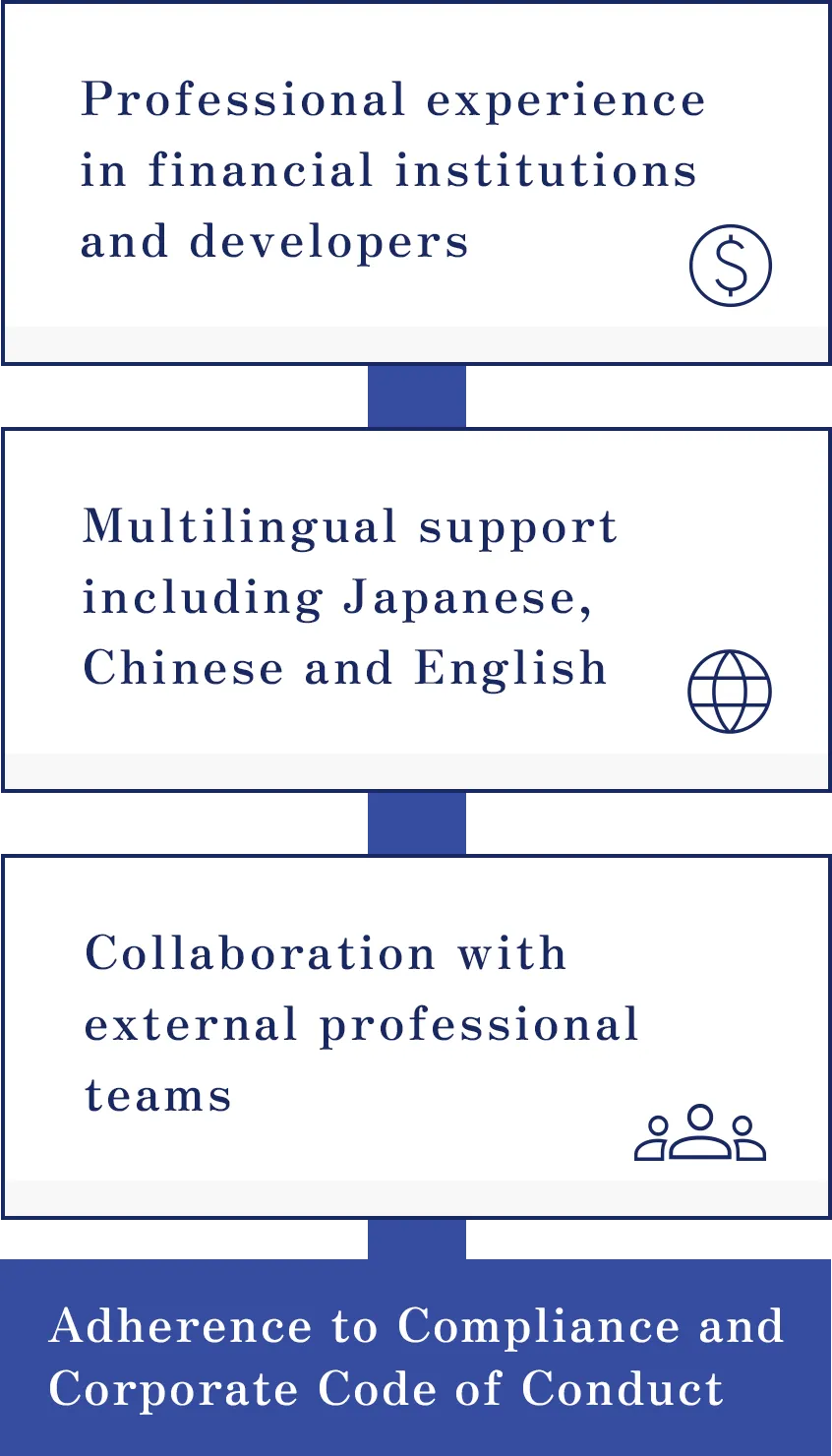 Our team members bring extensive experiences and a high level of expertise gained from working at global financial institutions and major Japanese developers. We are not only well-versed in legal matters and relevant regulations but also share a strong commitment to compliance, which is embedded in all our code of conduct.