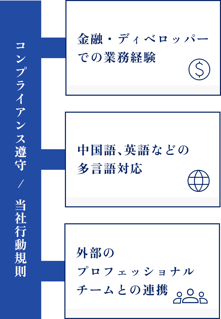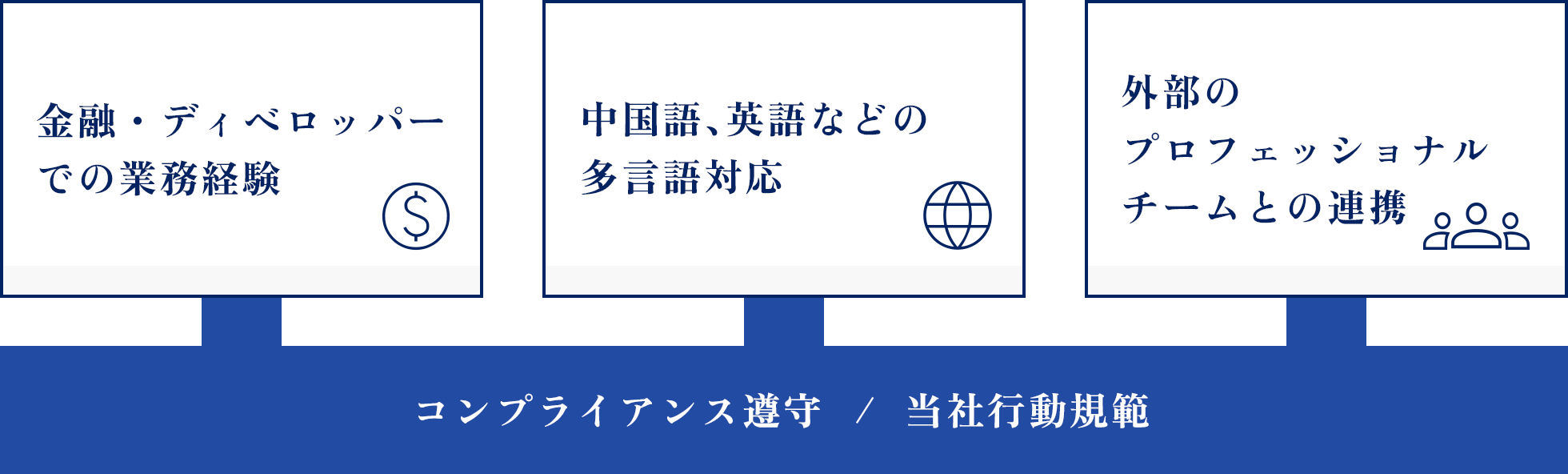 わが社のメンバーは、グローバルな金融機関や日本の大手ディベロッパーでの業務経験と高い専門性を持っています。また、法務や関連規制に精通するだけでなく、高いコンプライアンスへの意識を共有して、すべての行動規範に結集させています。